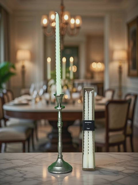 Das Set enthält zwei weiße Spiralkerzen, die für eine warme, gemütliche Atmosphäre sorgen und sich perfekt in jede Tischdekoration einfügen - ob modern, klassisch oder festlich.